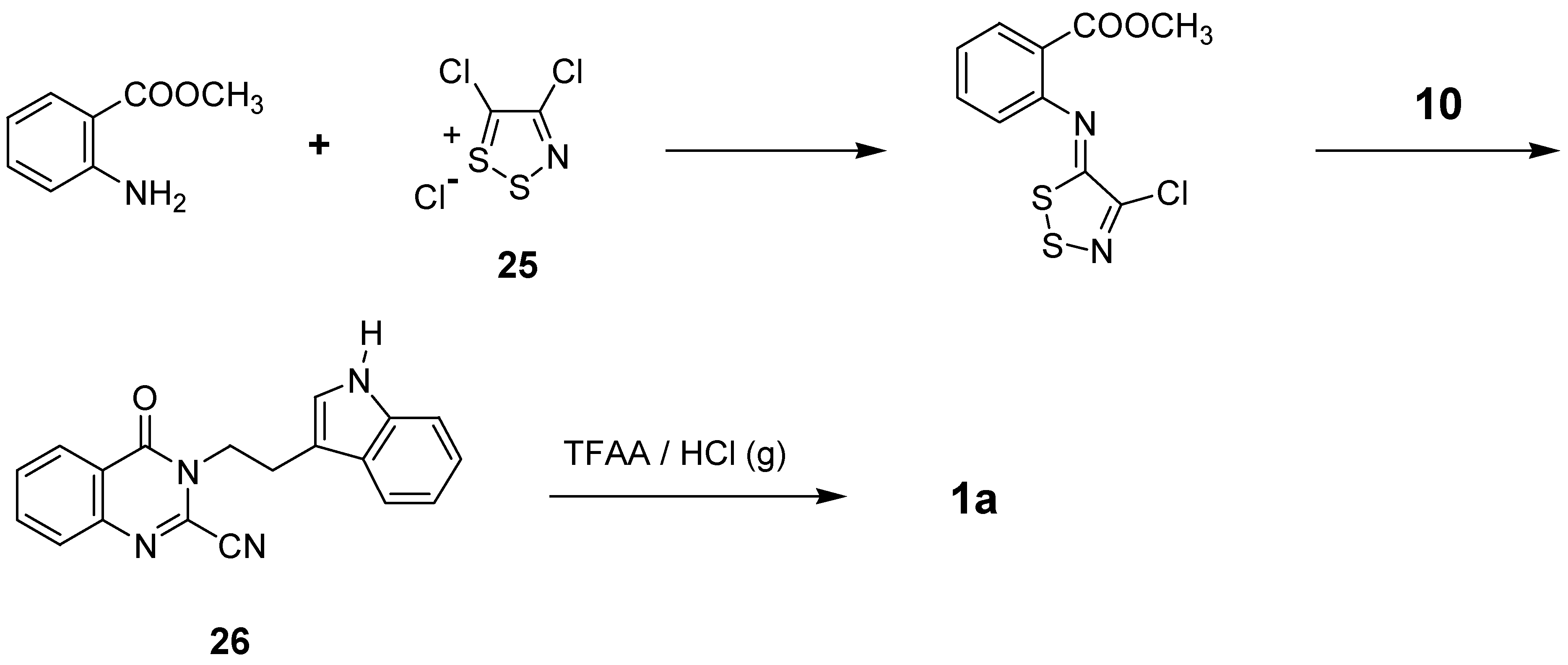 - Mohanta, P. K.; Kim, K. A Short Synthesis of Quinazolinocarboline Alkaloids Rutaecarpine, Hortiacine, Euxylophoricine A and Euxylophoricine D from Methyl N-(4-chloro-5H-1,2,3-dithiazol-5-ylidene)anthranilates. Tetrahedron Lett. 2002, 43, 3993–3996. [Google Scholar] [CrossRef]