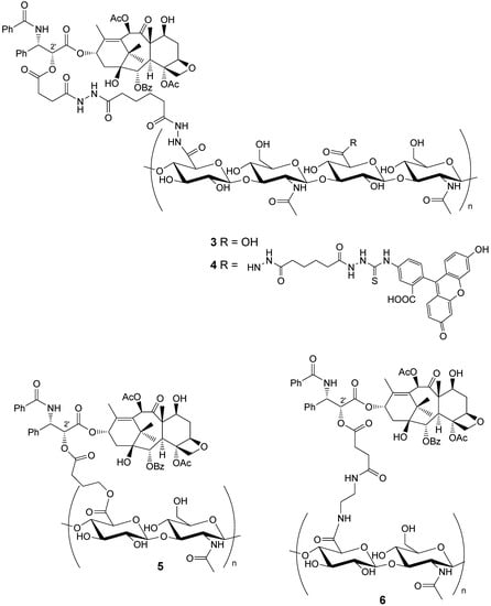 In the present review we shall deal only with HA-paclitaxel bioconjugates. To the best of our knowledge, only four HA-paclitaxel bioconjugates 3-6 (Figure 1) have been described so far in the literature, differing mainly in the anchor chain between HA and paclitaxel.
