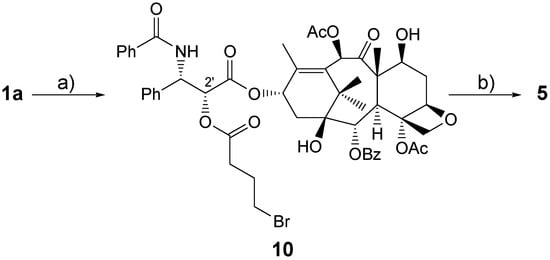 Thus, paclitaxel was treated at room temperature with 4-bromobutanoic acid in the presence of 1-[3-(dimethylamino)propyl]-3-ethylcarbodiimide hydrochloride (EDC) and N,N-dimethylpyridine-4-amine (DMAP) to cleanly give in 78 % yield paclitaxel 2’-(4-bromobutanoate) (10, Scheme 2). The authors confirmed the formation of a 2’-O-substituted paclitaxel derivative by the characteristic downfield shifts in the 1H- and 13C-NMR of the signals of H-C(2’) from δ(H) 4.77 [] to 5.50 and of C(2’) from δ(C) 73.2 [] to 74.2, respectively.