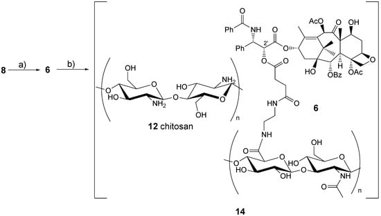 In the field of drug delivery, great attention has been recently devoted to the possibility of incorporating bioactive molecules into polymeric matrices [,,,,,]. An approach developed some years ago based on alternate deposition of polyanion and polycation layers leading to polyelectrolyte multilayer (PEM) films, constructed by the layer-by-layer (LbL) technique, can be used to build up polymeric matrices in a controlled manner. PEMs may present some advantages in drug delivery such as the possibility of including several drugs. It is, therefore, suitable for complex releasing pharmacokinetics. Tabrizian and co-workers [] reported on the assembling of HA-paclitaxel bioconjugate 6 (Figure 1), previously described by Prestwich and co-workers [] in a PEM system with chitosan 12 (CH) to give biomaterial 14.