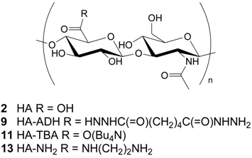 Hyaluronic acid (HA, 2) is a glycosaminoglycan found distributed throughout the connective, epithelial and neural tissues []. It is one of the main components of the extracellular matrix, contributes significantly to cell proliferation and migration and is also involved in the progression of some malignant tumors where it is highly concentrated; besides, it turns out to be an important signal for activating kinase pathways [,] and regulating angiogenesis []. Moreover, since some specific HA receptors (CD44, RHAMM) are overexpressed in various malignant cell types, linking an antitumor drug to 2 might improve targeting to cancerous cells and overcome, if the case, the problem of low drug hydrosolubility. For these reasons, HA has been linked to various antitumor drugs [,].