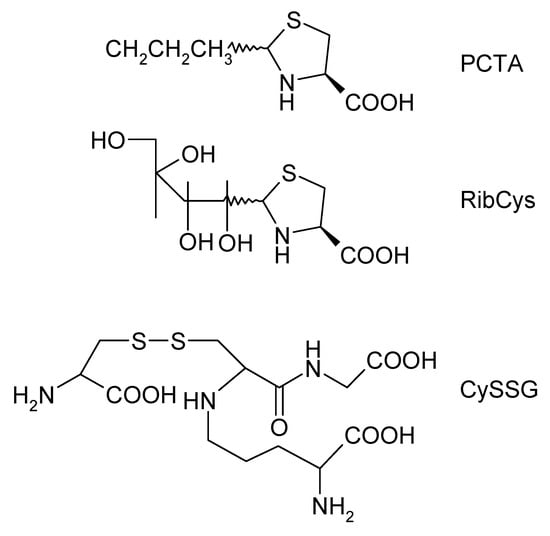 - Nagasawa, H.T.; Goon, D.J.; Muldoon, W.P.; Zera, R.T. 2-Substituted thiazolidine-4(R)-carboxylic acids as prodrugs of L-cysteine, protection of mice against acetaminophen hepatotoxicity. J. Med. Chem. 1984, 27, 591–596. [Google Scholar] [CrossRef]