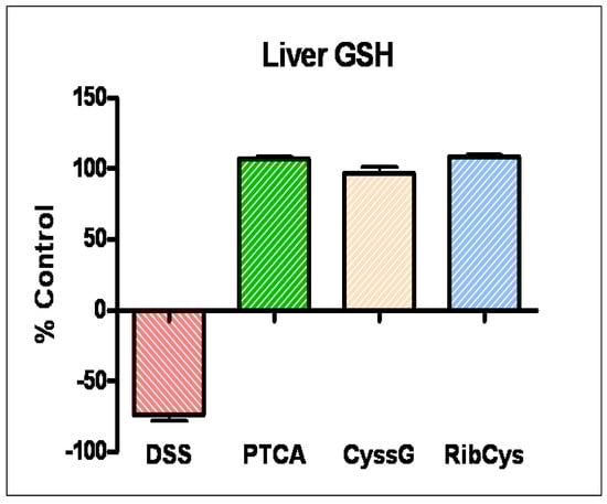 The results demonstrated a high degree of tissue selectivity in the APAP-induced depletion of GSH and cysteine concentrations, and in the effectiveness of PTCA in maintaining and even elevating sulfhydryl levels in extrahepatic tissues of APAP-treated mice [116], while the protective effect of PTCA was related to prevention of hepatic sulfhydryl depletion. Similarly, oral administration of PTCA provided protection against steatohepatitis by attenuating the expression of deleterious pro-inflammatory and fibrogenic genes in a dietary rat model [117]. Other studies showed that PTCA significantly increased GSH biosynthesis in cultured rat lens compared to untreated controls [118], and prevented naphthalene-induced experimental cataracts in mice [108]. Thus, our studies indicate that PTCA, RibCys and, to a lesser extent, CySSG, provide protection against colitis in this murine model. These data also reinforce our previous report describing the novel protective action of PTCA against different inflammatory complications including IBD [92,114,117].