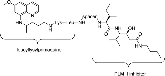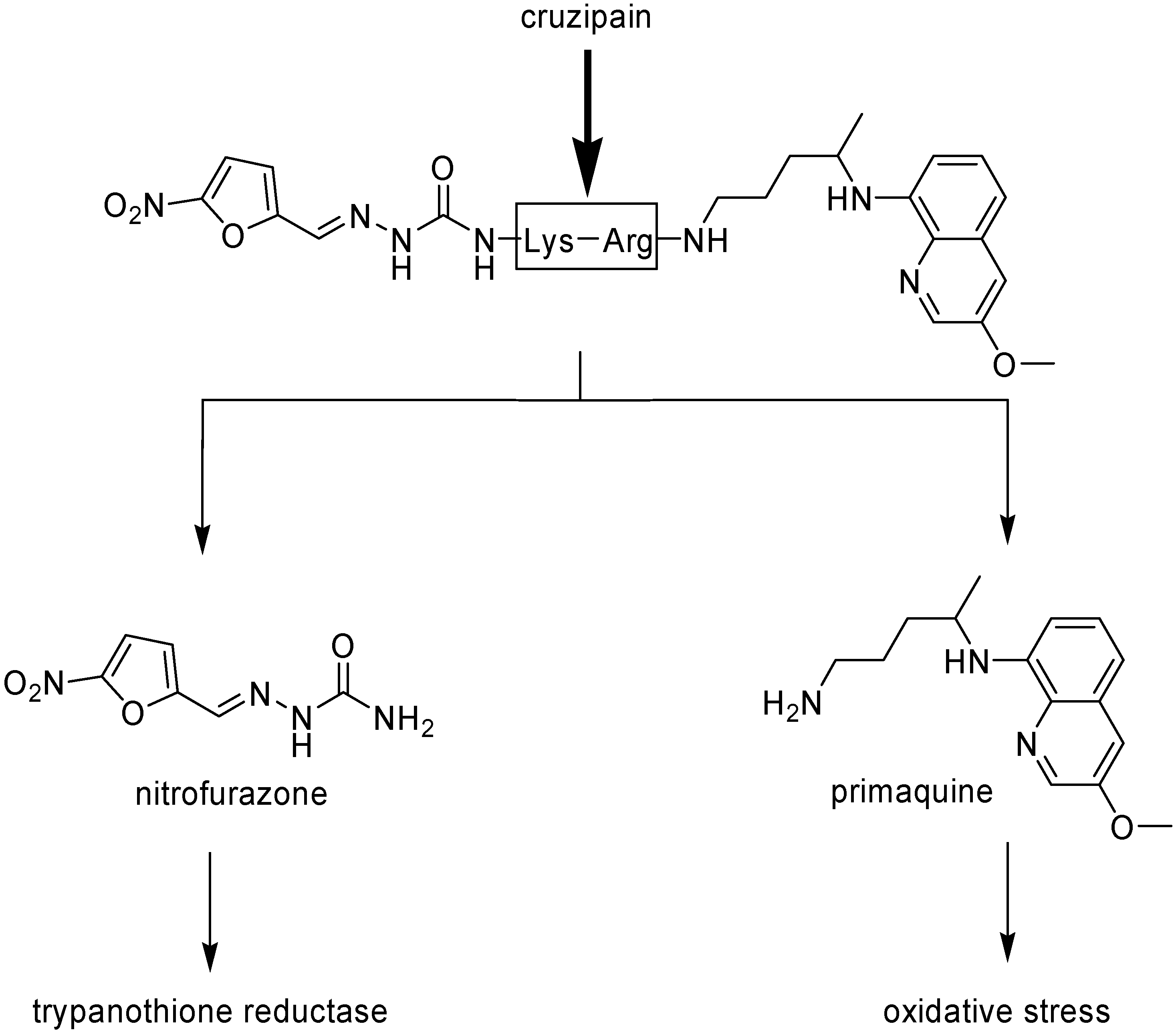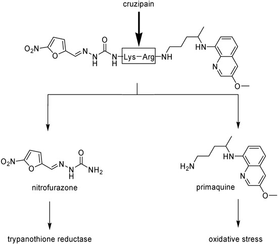 Chung, in 1996, synthesized mutual prodrugs of primaquine (PQ) and nitrofurazone (NF) using dipeptides as spacer groups. These peptides are selectively cleaved by cruzipain, a cysteinyl-protease found only in T. cruzi [46]. The rationale for this approach was the mechanism of the drugs: while primaquine increases the oxidative stress into the parasite, nitrofurazone (NF), as a trypanothione reductase inhibitor [47], does not allow the protective action of the enzyme, provoking the increase in the intracellular oxidative stress. The compound in which Lys-Arg was the spacer group has been the most active (Figure 1).