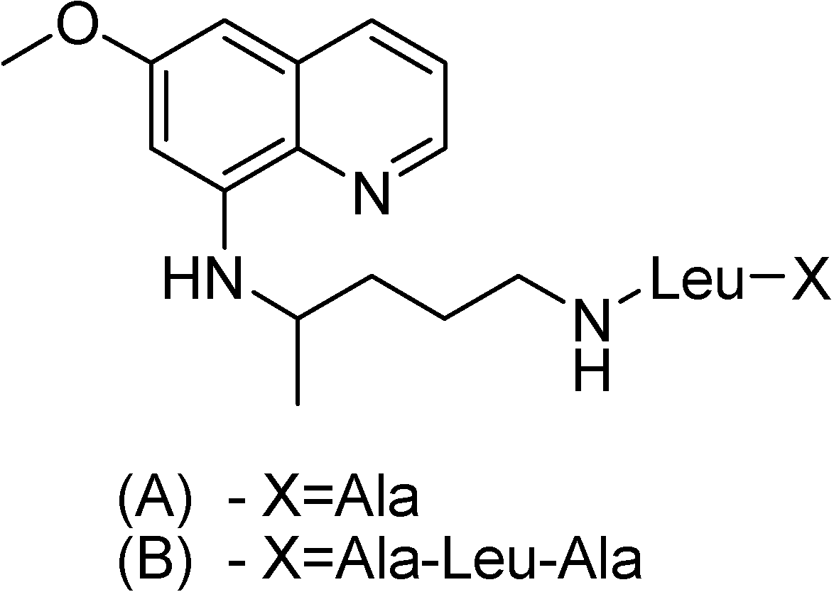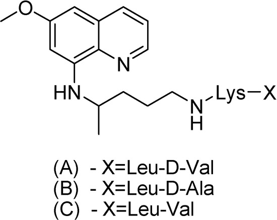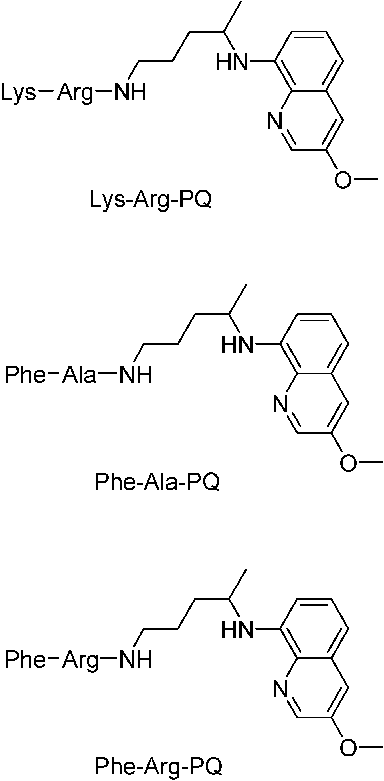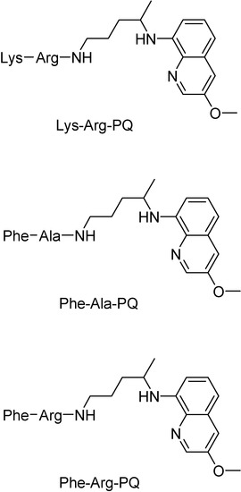 Dipeptide prodrugs of primaquine as synthesis intermediates were also shown to be active on LLC-MK2 cell culture infected with trypomastigotes forms of T. cruzi. It was demonstrated that Lys-Arg-PQ is active on T. cruzi development inside host cells, probably by interfering in the initial steps of trypomastigote-amastigote transformation. It was found that Lys-Arg-PQ is more active than Phe-Ala-PQ and Phe-Arg-PQ, suggesting that the specific cleavage has an important role in the release of PQ. The dipeptide Lys-Arg, putatively specific for cruzipain, was a good carrier for PQ and has potential to be used as a spacer group for the development of other PQ prodrugs in the future (Figure 2). Thus, Lys-Arg-PQ is a very promising compound for in vivo tests [48].