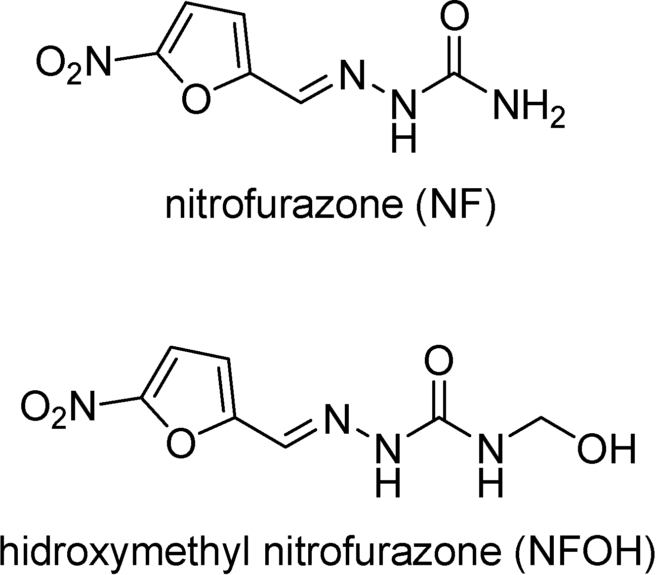 Chemical structures of nitrofurazone and its prodrug hydroxymethyl nitrofurazone.