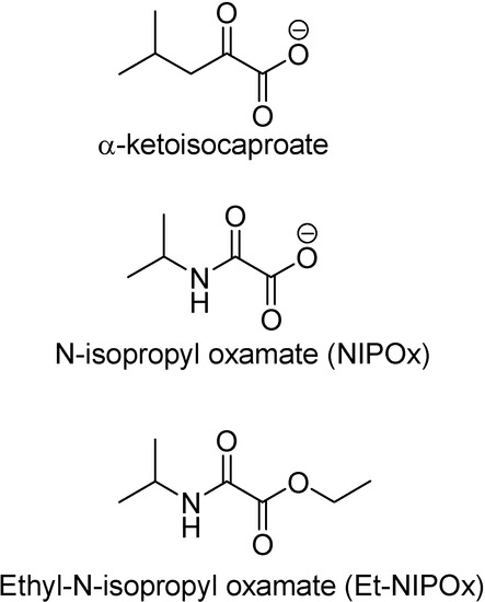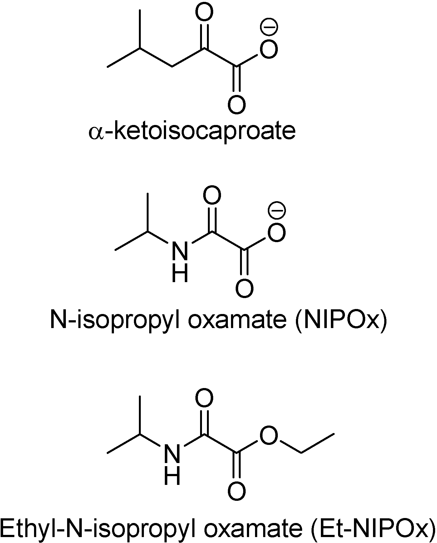 Chemical structures of α-ketoisocaproate, NIPOx and Et-NIPOx.