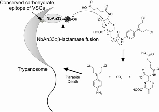In the case of African trypanosomiasis, isolation of a monoclonal antibody reactive toward multiple VSGs on viable parasites has been a challenge, as the conserved epitopes become cryptic upon the assembly of VSGs on the membrane of the parasite. To circumvent this problem, Stijlemans and co-workers developed an ADEPT approach potentially useful for the treatment of African trypanosomiasis using a nanobody named NbAn33, a mAb specific for the conserved carbohydrate epitope of VSGs fused to a β-lactamase enzyme for activation of a cephalosporin mustard prodrug [67,68]. Nanobodies were introduced by Stijlemans and co-workers [69] and are antigen-binding fragment with a molecular mass of only 15 kDa, coming from the serum of Camelidae which contains a high proportion of functional antibodies with no light chains [70]. The in vitro assay was carried out with sub-lethal doses of 0.5 to 10 μM of the prodrug following the incubation with the NbAn33::β-lactamase conjugate and succeeded.