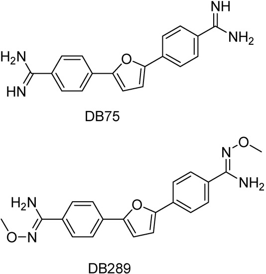 Aromatic diamines represent a class of compounds with broad-spectrum antimicrobial activity. DB75 [2,5-bis(4-amidenophenyl)furan] is an important aromatic diamine that is active against Trypanosoma sp in vitro [76;77] and DB289 [2,5-bis-(4-amidinophenyl)furan bis-O-methyl-amidoxime] is its orally active amidoxin prodrug (Figure 6). The latter is in phase IIb human clinical trials for treatment of early-stage human African trypanosomiasis, Pneumocystis jiroveci carinii pneumonia and malaria. Charlotte and co-workers found that mitochondrion is a cellular target of DB75 in yeast cell. This finding can aid in the target-based design of new antimicrobial aromatic diamines [62].