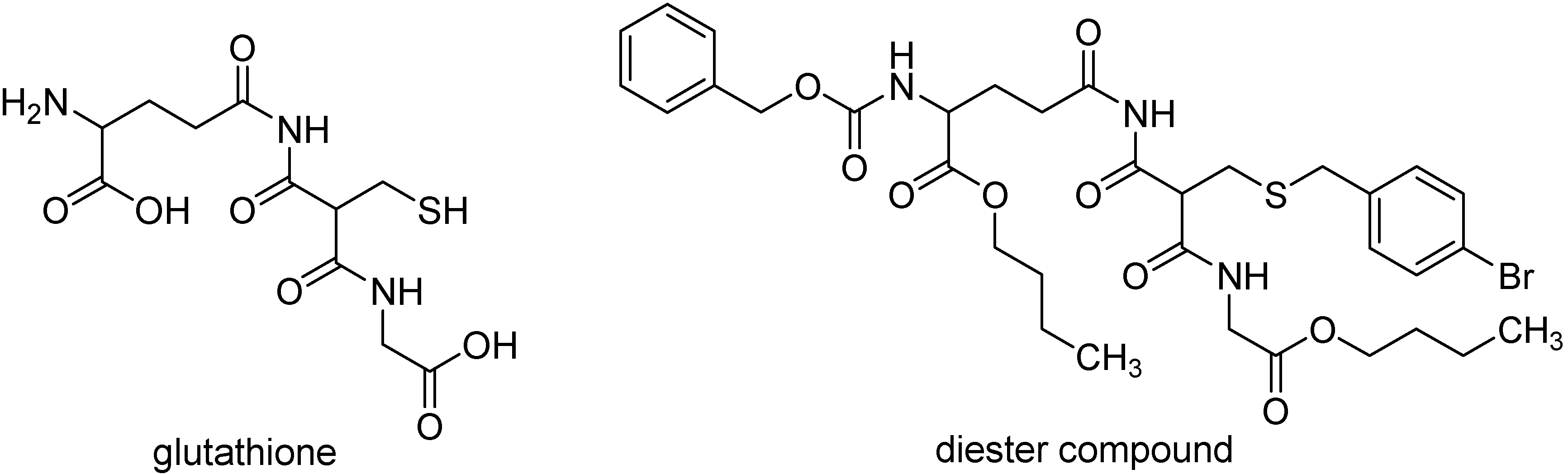 Trypanotione plays a central role in the metabolism of trypanosomatids, like T. brucei, T. cruzi and L. donovani, acting both as a source of reducing equivalents and as a defense against oxidative stress [78]. Diester compounds per se were considered to be ineffective inhibitors of trypanotione metabolism, suggesting that these compounds might act as prodrugs, increasing the membrane penetration of glutathione derivatives prior to cleavage into possible gluthatione derivatives, which includes combinations of monoesters, free acids, and amines, some of which are inhibitors of trypanothione metabolism [78]. The dibutyl ester compound presented in Figure 7 shows moderate activity against L. donovani in an in vitro assay, and a higher activity against T. brucei.