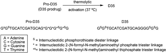 Grajowski and co-workers [83] reported the synthesis and characterization of a CpG ODN functionalized with thermolytic 2-(N-formyl-N-methyl)aminoethyl (fma) phosphorothioate triesters (Figure 8). Those compounds are activated only by temperature (37 oC). The half-life of thiophosphate deprotection was estimated to be 73 h and the complete deprotection was achieved within 600 h. Studies in mice infected with Leishmania major metacyclic promastigotes [83] prove that CpG ODN fma1555 was as effective as that of CpG ODN 1555 in reducing the size of Leishmania lesions in local intradermal administration.