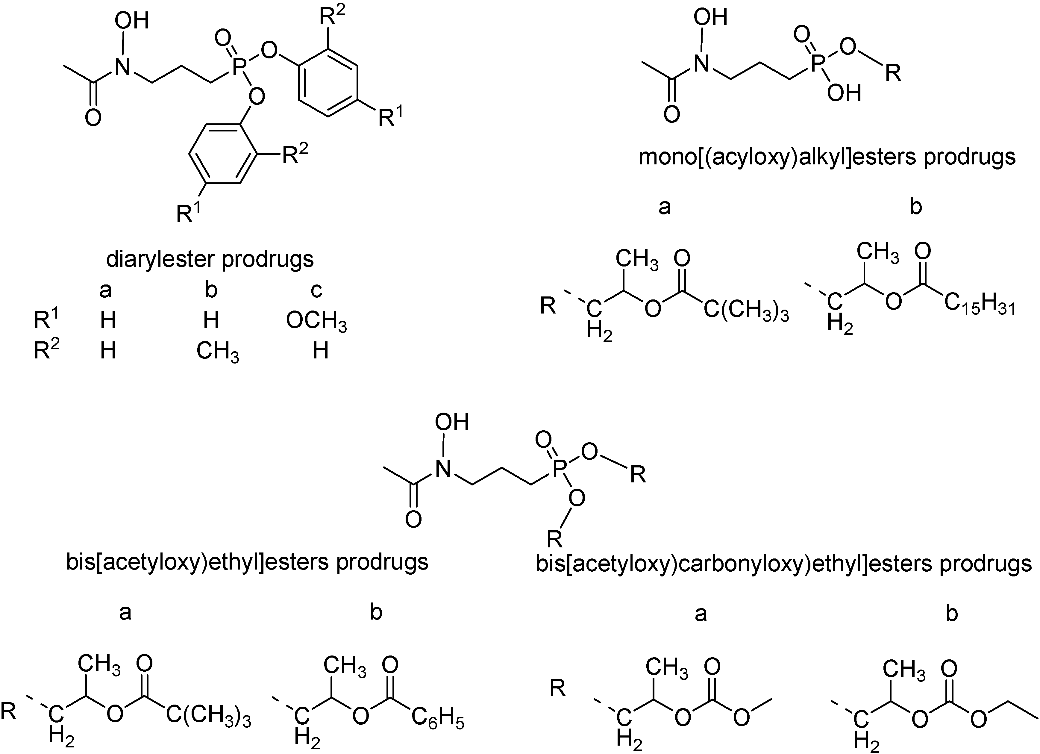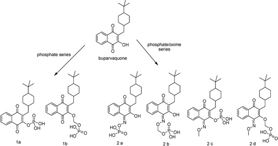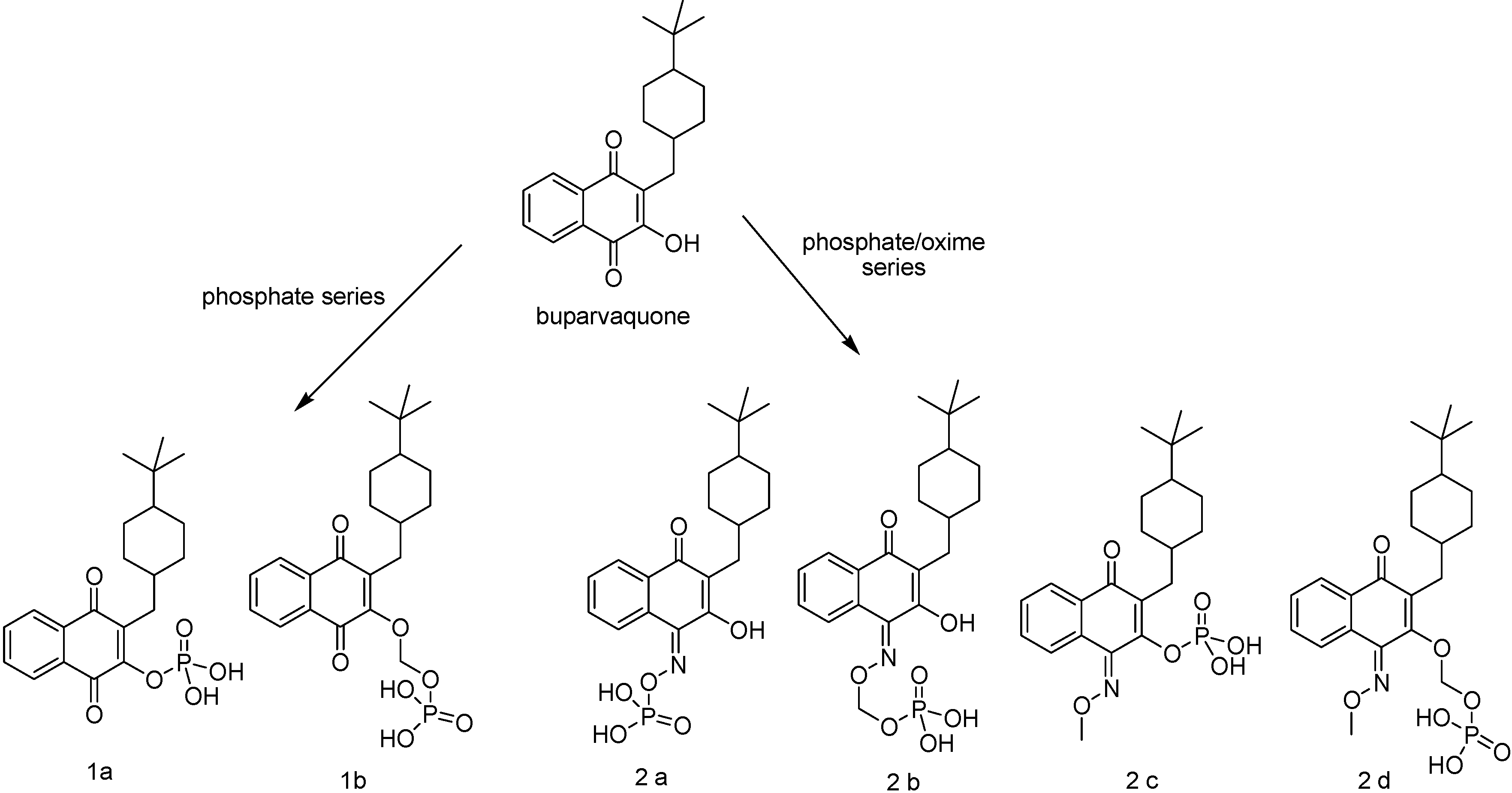 Mäntylä and co-workers [99,100] have synthesized two series of phosphate prodrugs (Figure 11) with the objective to enhance the drug bioavailability, increasing its aqueous solubility. This goal can be reached by the introduction of a phosphate promoiety in a hydroxyl group [101]. Neverthless, a phosphate carrier protecting a hydroxyl group is not always cleaved enzymatically due to steric hindrance. Phosphonooxymethyl prodrugs [102,103] can have more lability, due to a two-step hydrolysis reaction, one with enzyme participation and the other with a spontaneous release of the parent drug [99]. Compounds 1a and 1b presented a rapid buparvaquone release in alkaline phosphate solution, while only 1b was able to release the drug in human skin homogenate. These prodrugs had the same potency as buparvaquone against the promastigote and amastigote form of most species investigated. They also presented improved efficacy in in vivo Leishmania major and Leishmania donovani infections [104].