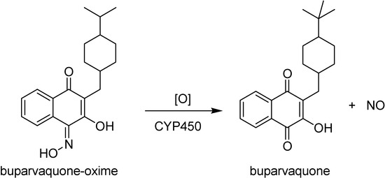 The conversion of buparvaquone-oxime into buparvaquone by enzymatic oxidation and release of NO.