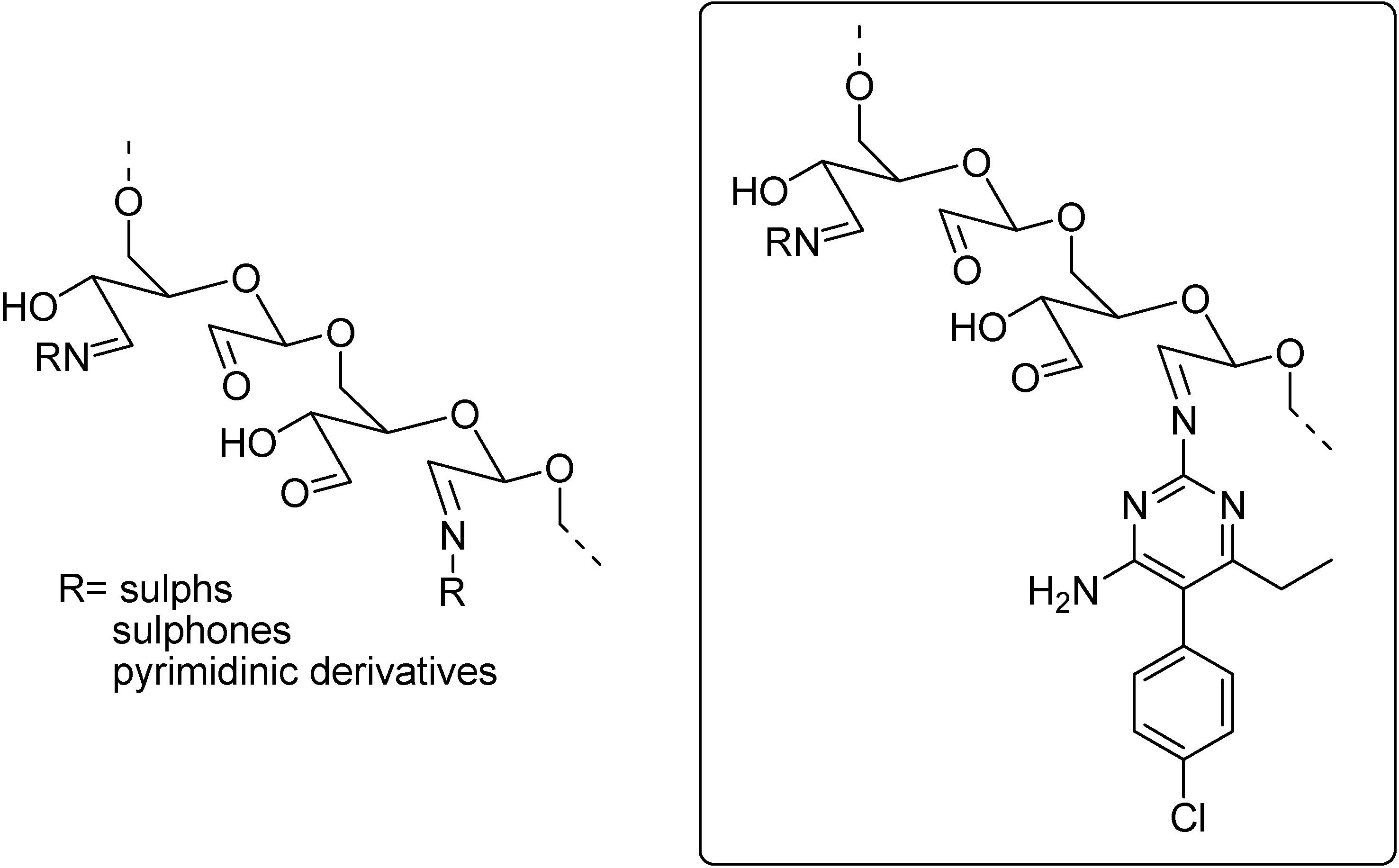 Ferreira and co-workers used polysaccharides as polymeric drug carriers to develop slow releasing prodrugs. The group developed several prodrugs using oxidized polysaccharides of antimalarial drugs as sulphadoxine, sulphadiazine, dapsone as well as some pyrimidinic derivatives, for instance, pyrimethamine and trimethoprim (Figure 13) [108,109,110].
