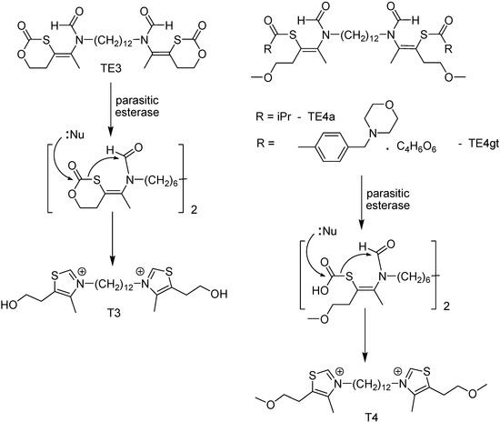 Among the targets available for chemotherapeutic design, phospholipid metabolism has been considered as an attractive biochemical step for developing new malaria chemotherapy. It is important for the parasite, is absent from normal mature human erythrocytes [111], and these cells have their content increased by around 500% because of the parasite metabolic activity. Because phosphatidylcholine is the major phospholipids, some monoquartenary and bisquartenary ammonium compounds have been used for malaria chemotherapy, showing exceptional in vitro and in vivo antimalarial proprieties, with no mutagenic activity [112,113]. Nevertheless, these compounds, structuraly similar to choline, present a cationic group which impairs their oral absorption [114]. Thus, prodrugs that mask the ionizable groups through thioester function were designed and synthesized (Figure 14) [112,113].