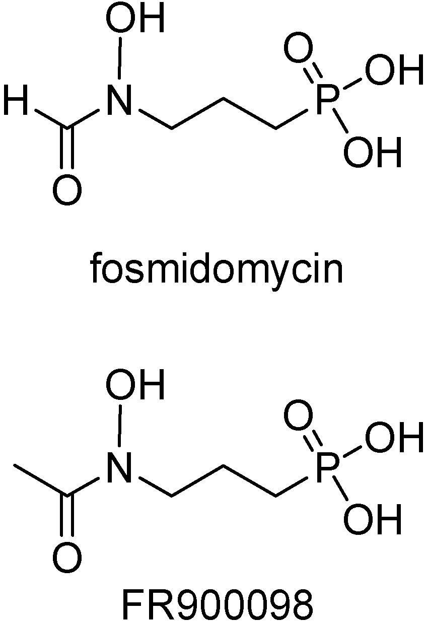 Fosmidomycin (Figure 15), involved in the inhibition of 1-deoxy-D-xylulose 5-phosphate (DOXP) reductoisomerase, an important and specific pathway in the isoprenoid synthesis [115], was shown to be active in recent clinical trials conducted in Gabon and Thailand with uncomplicated P. falciparum malaria [116]. Its acetyl derivative is around twice as active in vitro against P. falciparum [117] and in a P. vinckei mouse model [118]. Besides, it inhibited the growth of multidrug resistant P. falciparum strains in vitro [117].