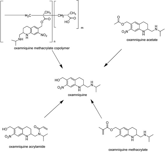 - Parise Filho, R.; Menezes, C.M.S.; Pinto, P.L.S.; Paula, G.A.; Brandt, C.A.; Siveira, M.A.B. Design, synthesis, and in vivo evaluation of oxamniquine methacrylate and acrylamide prodrugs. Bioorg. Med. Chem. 2007, 15, 1229–1236. [Google Scholar] [CrossRef]
