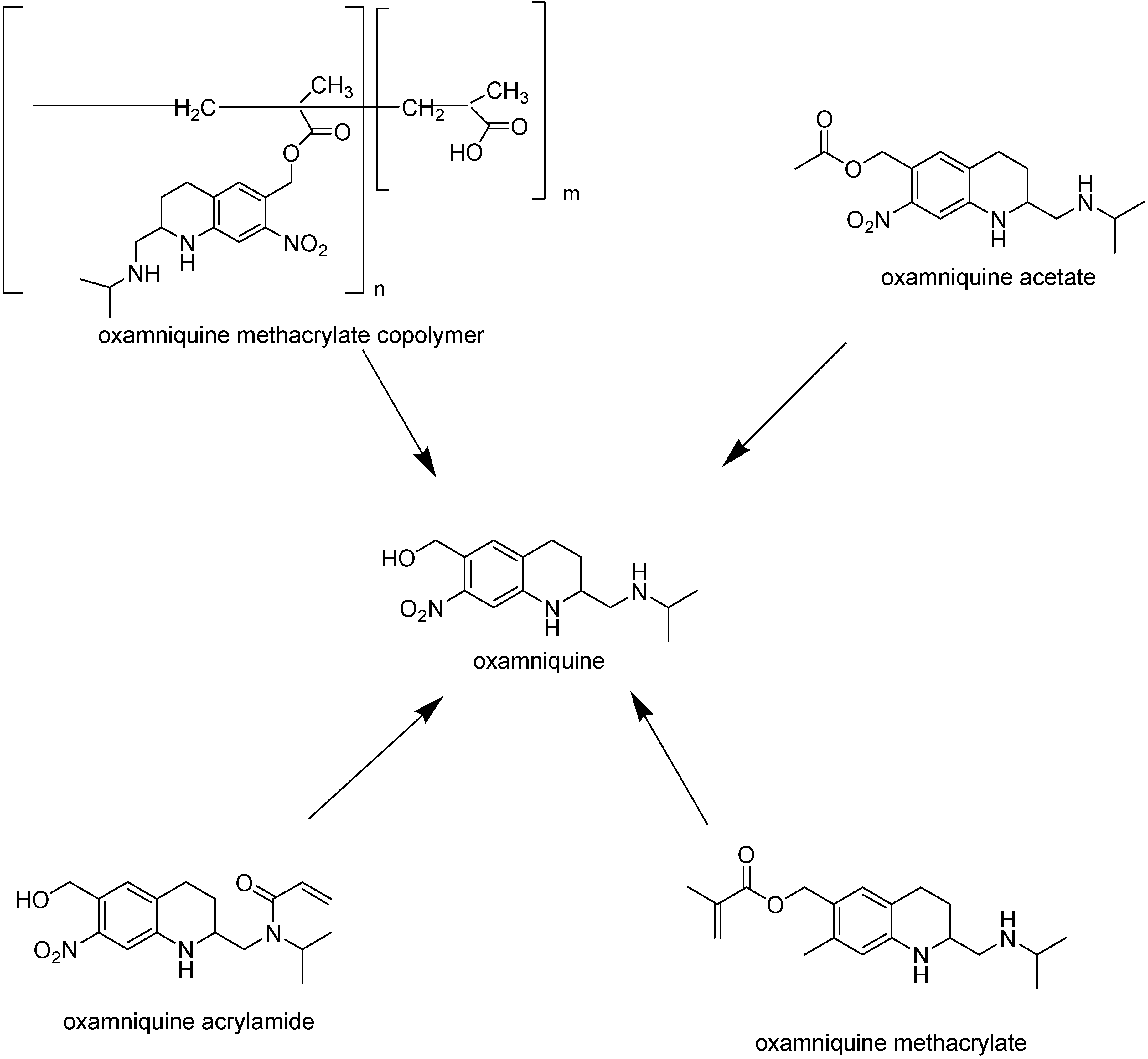 - El-Hamouly, W.; Pica-Mattocia, L.; Cioli, D.; Schwartz, H.M.; Archer, S. Studies on some derivatives of oxamniquine. J. Med. Chem. 1988, 31, 1629–1631. [Google Scholar] [CrossRef]