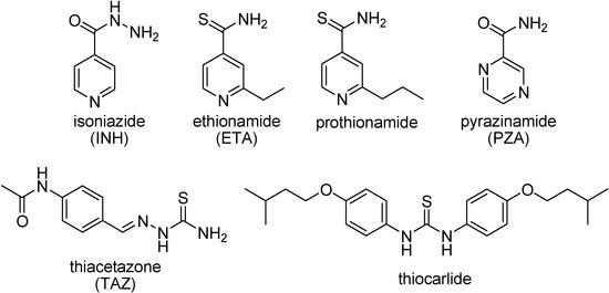- DeBarber, A. E.; Mdluli, K.; Bosman, M.; Bekker, L. G.; Barry III, C. E. Ethionamide activation and sensitivity in multidrug-resistant Mycobacterium tuberculosis. Proc. Natl. Acad. Sci. U. S. A. 2000, 97, 9677–9682. [Google Scholar]