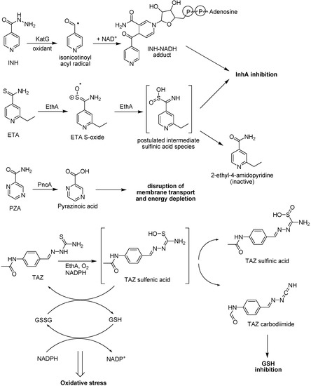 - Hanoulle, X.; Wieruszeski, J-M.; Rousselot-Pailley, P.; Landrieu, I.; Locht, C.; Lippens, G.; Baulard, A. R. Selective intracellular accumulation of the major metabolite issued from the activation of the prodrug ethionamide in mycobacteria. J. Antimicrob. Chemother. 2006, 58, 768–772. [Google Scholar] [CrossRef]