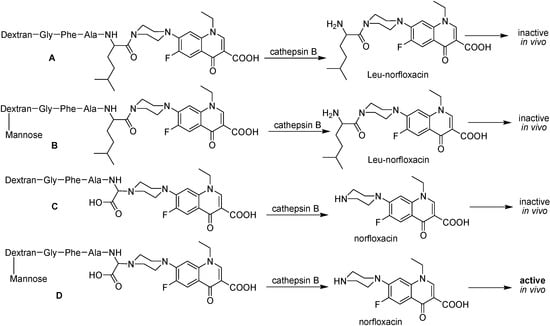 - Roseeuw, E.; Coessens, V.; Balazuc, A-M.; Lagranderie, M.; Chavarot, P.; Pessina, A.; Néri, M. G.; Schacht, E.; Marchal, G.; Domurado, D. Synthesis, Degradation, and Antimicrobial Properties of Targeted Macromolecular Prodrugs of Norfloxacin. Antimicrob. Agents Chemother. 2003, 47, 3435–3441. [Google Scholar] [CrossRef]