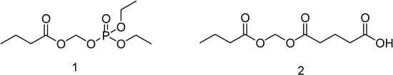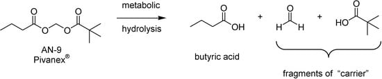 - Nudelman, A.; Gnizi, E.; Katz, Y.; Azulai, R.; Cohen-Ohana, M.; Zhuk, R.; Sampson, S.R.; Langzam, L.; Fibach, E.; Prus, E.; Pugach, V.; Rephaeli, A. Prodrugs of butyric acid. Novel derivatives possessing increased aqueous solubility and potential for treating cancer and blood diseases. Eur. J. Med. Chem. 2001, 36, 63–74. [Google Scholar] [CrossRef]