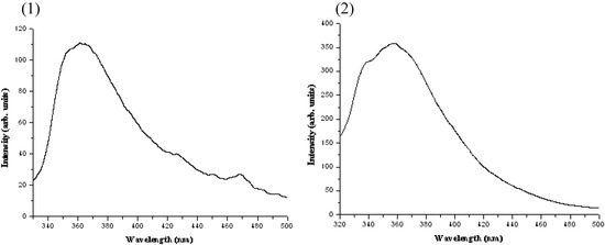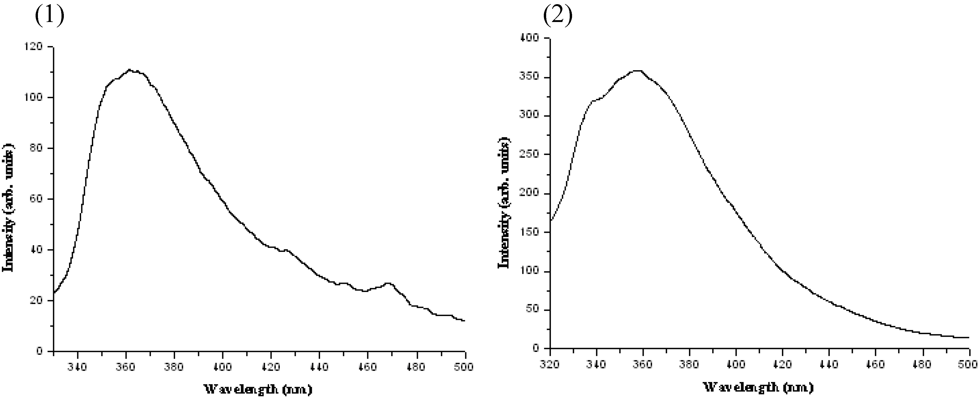Emission spectrum of the 4a in (1) DMF solution (1×10-5M; excited at 302 nm) and (2) solid state (excited at 315nm).