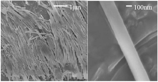 Subsequently, an atypical field emission scanning electronic microscopy (Field-emission SEM) image of the synthesized microfibers was obtained, in order to examine the configuration of the aggregate. As shown in Figure 3a, the 4a sample consists of rather regular microfibers with lengths up to the micrometer range, and many microfibers are in an orderly arrayed pattern and each of these microfibers is almost uniform in size. In addition, there are also some branched or short microfibers in the fibrous networks. As seen from the magnified image of a single one (Figure 3b), the microfiber is smooth and clean with a diameter of 278 nm. It suggests a possible formation mechanism by which 4a initially self-organizes and then assembles into shorter microfibers, after which it self-assembles into longer microfibers.