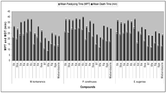 32]. Tween 80 (0.5%) in distilled water was used as control and mebendazole was used as a reference compound. The paralysis and death times were noted and their mean was calculated for triplicate sets. The death time was ascertained by placing the earthworms in warm water (50 °C) which stimulated the movement, if the worm was alive. The anthelmintic study results are tabulated in