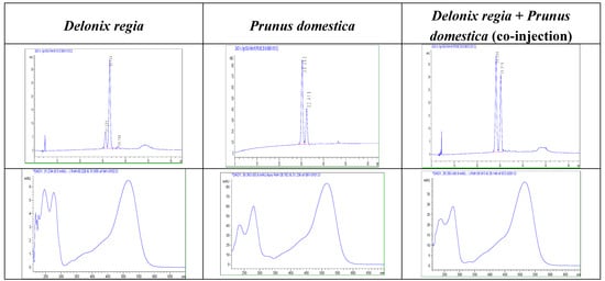 Prunus domestica extracts are known to contain two major anthocyanins: cyanidin 3-O-glucoside and cyanidin 3-O rutinoside [12,13]. As shown in Figure 2, the HPLC profile of the co-injection of Delonix regia and of Prunus domestica water-extracts still showed only two peaks, with increasing peak heights for both Delonix regia anthocyanins (peaks 1 and 2, Figure 1) compared to the peak heights observed for the Delonix regia extract HPLC. Thus, we may conclucde that these two extracts contained the same two anthocyanins, matched by their HPLC retention times and on chromatography confirmation using sample co-injection.