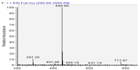 Molecular ion peaks [M+H]+ were m/z 449 for compound 1 and m/z 595 for compound 2, respectively. Fragmentation (MS1) of compound 1 led to a loss of 162 u.m.a., and for compound 2 to a loss of 162 u.m.a. (MS1), then a loss of 146 u.m.a. (MS2). The 162 u.m.a. fragment may correspond to either a glucose or a galactose fragment.