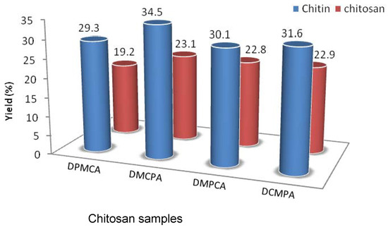 The yields depended on the CS extraction method, as DMCPA gave the highest chitin and CS yield (34.5 and 23.1%, respectively) and DPMCA gave the lowest (29.3 and 19.2%). However, the results indicated that when decoloration and demineralization steps were performed before demineralization and deproteinization, CS production was slightly increased. It has been repeatedly reported that the content of chitin in the shell waste of crustacean varies widely depending on the peeling conditions during processing, as well as the species [6,7,8]. Crustacean shells contain chitin amounts ranging from 13 to 42%, which in the case of crab (13 to 26%) is lower that in the case of shrimp (14 to 42%) and krill (34 to 49%) [8]. In comparison to commercial resources of chitin, Artemia urmiana had high levels of chitin contents, similar to krill.