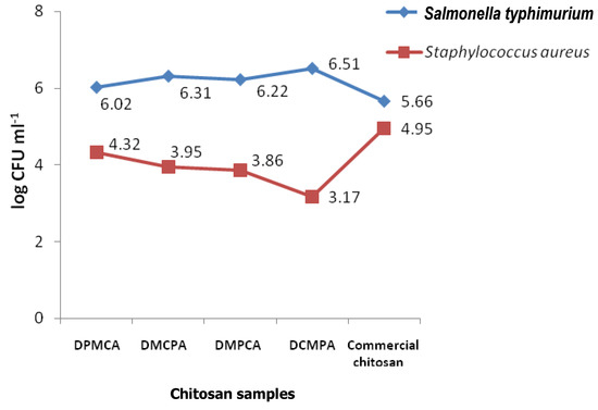 Antimicrobial activities of CS against various pathogens and food-spoilage microorganisms were investigated for the purpose of their application in food processing and preservation [25,26,27]. As illustrated in Figure 2, 0.1% DCMPA, with average MW of 5.7 ×105 D, had a stronger antibacterial effect on Staphylococcus aureus than DPMCA, DMCPA, DMPCA and commercial CSs, respectively. It reduced the initial number (8.12 log CFU mL-1) of S. aureus up to 3.17 log CFU mL-1. Moreover, addition of CS (0.1%) reduced the number of Salmonella typhimurium from 8.52 to 6.02 log CFU mL‑1. According to Yang et al. [28] cells of S. aureus were found most susceptible to CS and CS derivatives in the late-exponential phase, followed by late stationary phase and mid-exponential phase.