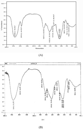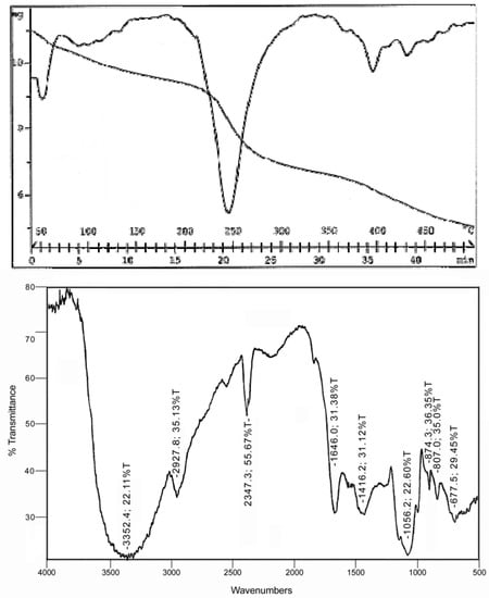 The degradation temperature of sample A (10 mg) was 250° C in 20 min, leaving a residue of about 5 mg (Figure 4A). Moreover, the infrared spectrum of this biopolymer showed the characteristic peak signals of polysaccharides: OH stretching at 3.400 cm-1, CH and C=O stretching at 2929 cm-1 and 1730-1660 cm-1 respectively. A SO group was absent, in fact no signals were detected at 1240 cm-1 (Figure 4B).