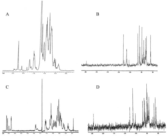1H-NMR spectra of EPS(2) and EPS(3), panels A and C, respectively. 13C-NMR spectra of EPS(2) and EPS(3), panels B and D, respectively.