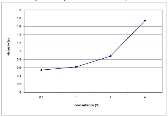 where t is the time (s) employed from the polysaccharide solution to cover an established distance in the viscometer, t0 is the time (s) employed from the distilled water to cover an established distance in the viscometer, and C is the concentration (%) of the polysaccharide solution. As concentration increases coils start to overlap and become entangled, with viscosity showing a more marked dependence on concentration reaching η=1.7 at 4% of concentration (Figure 3). The viscosity does not change drastically respect to the increase of pH and its maximum value was obtained at pH 3.0 for a 1% polysaccharide solution in 50 mM citrate buffer (η=3.29).