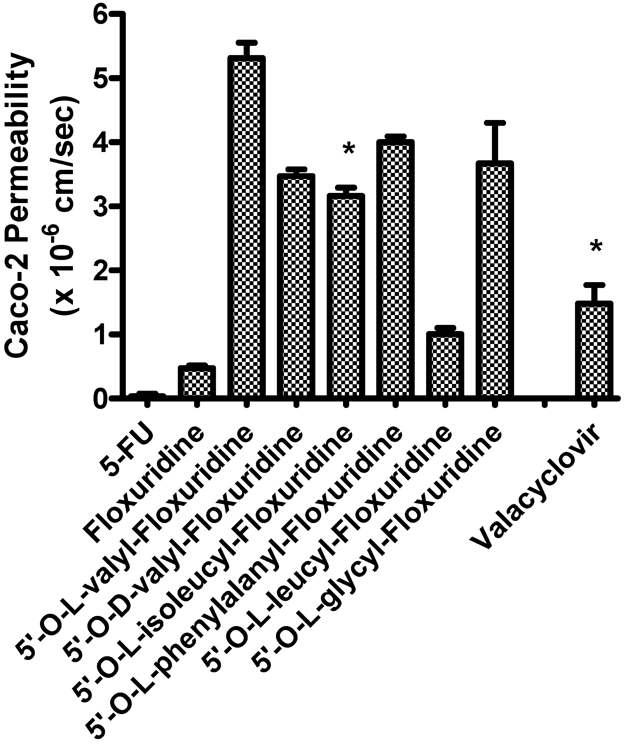 The apical-to-basolateral permeabilities of amino acid monoester prodrugs of floxuridine and their parent drugs, floxuridine and 5-FU, were determined at 37°C in Caco-2 cell monolayers. Figure 1 shows the membrane permeability values in Caco-2 cell system. Floxuridine, a prodrug form of 5-FU, showed a 12-fold higher Caco-2 membrane permeability than 5-FU. All floxuridine prodrugs exhibited 2- to 11-fold higher and 26- and 140-fold higher membrane permeability than floxuridine and 5-FU, respectively. Surprisingly, 5ʹ-O-d-valyl-floxuridine exhibited permeability that was as high as that of other amino acid ester prodrugs. No simple correlations between membrane permeability and transporter affinity in Caco-2 cells were evident in the prodrugs, even though our group previously reported excellent linear correlations between them in HeLa/PEPT1 cells [40]. The floxuridine amino acid monoester prodrugs, with the exception of 5ʹ-O-l-leucyl-floxuridine, demonstrated excellent membrane permeability in Caco-2 cells, better than that of a reference compound, valacyclovir (Figure 1). The detection of only 5-FU in the basolateral receiver compartment following transport of floxuridine across Caco-2 cell monolayers suggests the instability of glycosidic bond. Drug/prodrug stability in the mucosal cell would affect its drug membrane permeability and, therefore, the observation of low permeability of 5ʹ-O-l-leucyl-floxuridine among those prodrugs may be partly due to its rapid hydrolysis to floxuridine, 5-FU and beyond (Table 2).