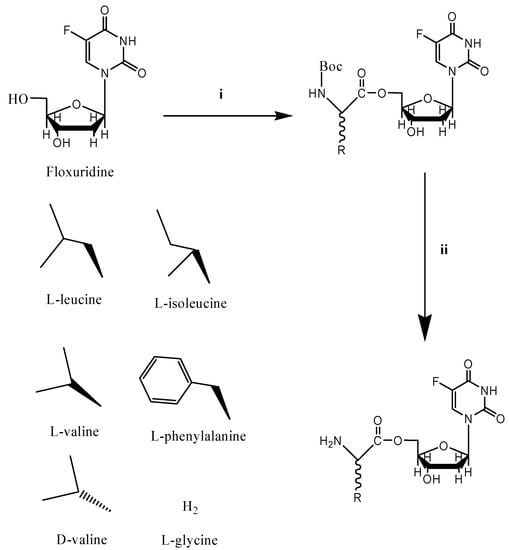 - Vig, B.S.; Lorenzi, P.J.; Mittal, S.; Landowski, C.P.; Shin, H.C.; Mosberg, H.I.; Hilfinger, J.M.; Amidon, G.L. Amino acid ester prodrugs of floxuridine: synthesis and effects of structure, stereochemistry, and site of esterification on the rate of hydrolysis. Pharm. Res. 2003, 20, 1381–8. [Google Scholar] [CrossRef]