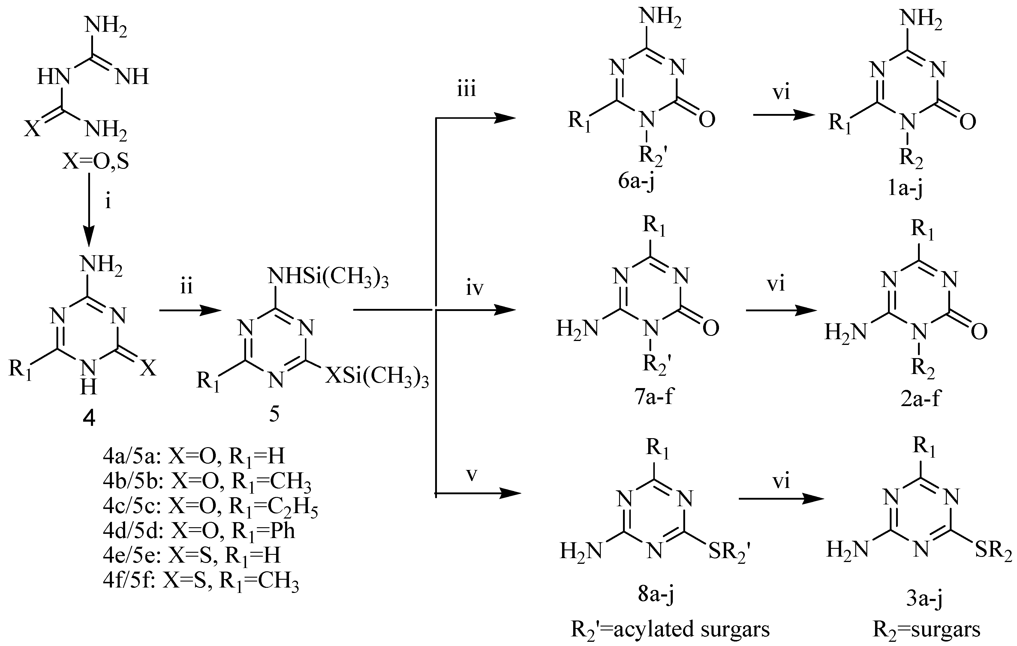 A mixture of guanylurea or guanylthiourea, orthoesters and dimethylformamide was refluxed for 90 min and allowed to stand at room temperature, the precipitate were recrystallized from the solution, then filtered off to give 4-amino-6-alkyl/aryl-1,3,5-triazin-2(1H)-ones 4a-f. The structures were identified by MS [10,11,12]. Then a mixture of 4, HMDS and (NH4)2SO4 or pyrimidine as catalyst was refluxed for 12-16 h. After evaporation under vacuum, the silylated bases 5a-f were obtained [13,14]. The crude product was used in glycosylation without further purification. Silylated base (1 equiv) was dissolved in anhydrous acetonitrile, to this solution were added 1-O-acetyl-2,3,5-tri-O-benzoyl-β-d-ribose (1 equiv.) or acetylated pyranosyl sugar (1 equiv.) and SnCl4 (2 equiv.) or TMSOTf (2 equiv.) [15] in acetonitrile. The mixture was left standing at room temperature under stirring for 10-18 h, then diluted in chloroform and neutralized with a saturated solution of sodium bicarbonate. The organic layer was separated, dried and evaporated. The residue was purified by flash column chromatography (CHCl3-CH3OH). Acetylated nucleosides 6-8 were obtained as white solids which were identified by 1H-NMR and MS spectra. Then the acetylated nucleosides and saturated NH3-CH3OH solution were stirred at room temperature for 5 h and evaporated to dryness. The residue was purified by flash column chromatography (CHCl3-CH3OH), and recrystallized from water/methanol to give target nucleosides 1-3 as whte crystals.