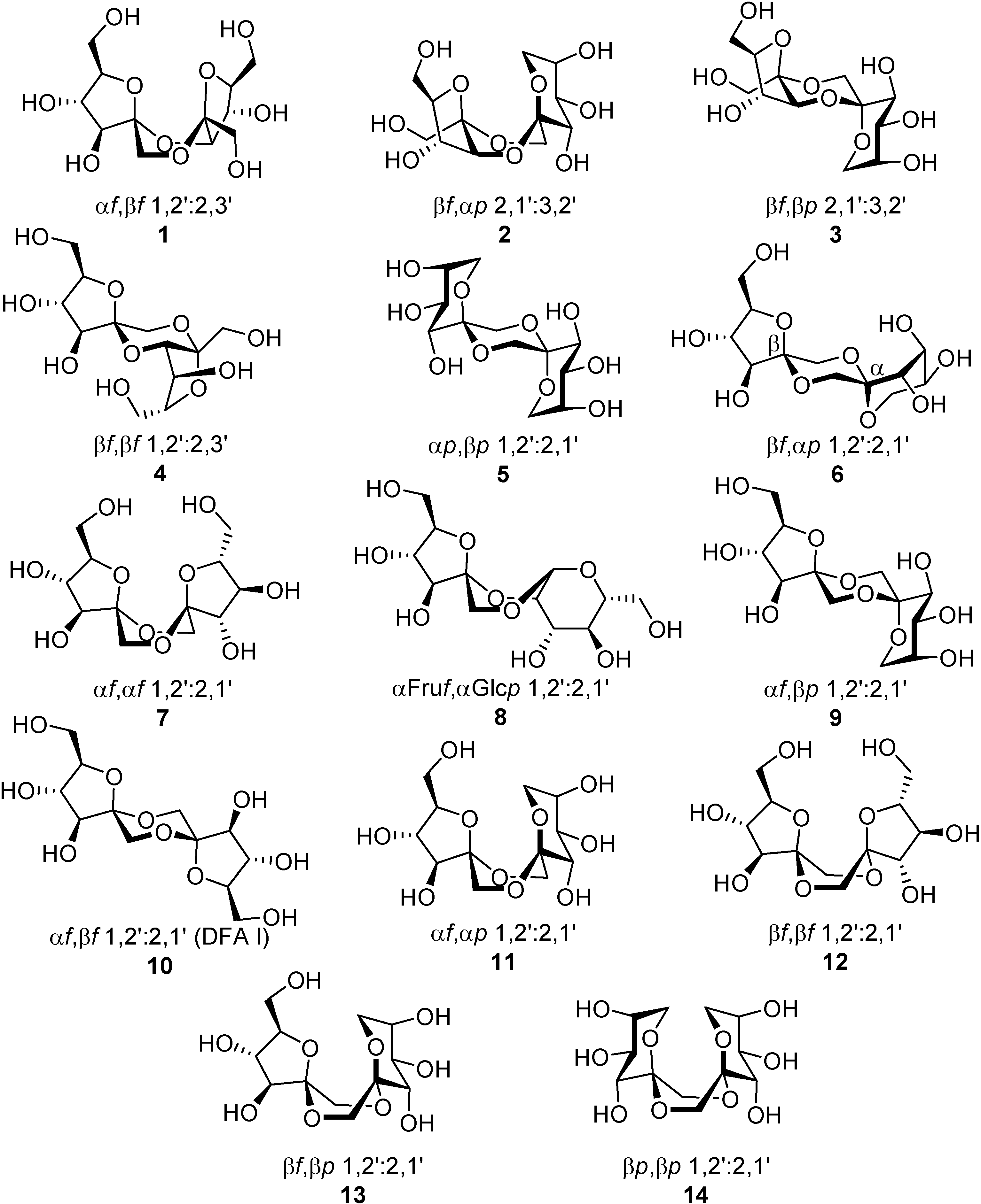 Di-d-fructose dianhydrides (DFAs) comprise a diverse family of mono- or dispirocyclic acetals obtained by condensation of two fructose molecules, with formation of two reciprocal glycosidic linkages. Their basic mono- or bis-spiroketal framework resembles that found in many relevant natural products, including steroidal saponins, polyether ionophores, macrolide antibiotics, insect pheromones, and toxic metabolites from algae and fungi [1,2,3,4,5], and is the target of much synthetic effort [6,7,8,9,10,11,12,13,14]. DFAs are formed upon thermal and/or acidic activation of sucrose- and/or d-fructose-rich materials. The first evidence of DFA formation dates back to the XIXth century, with the observation that the hydrolysate of inulin with dilute acid shows reduced levorotation as compared with pure fructose [15]. In the late 1920s some DFAs were isolated and, to some extent, characterised as dextrorotatory, unfermentable and non-reducing sugars [16,17]. The existence of a battery of DFA diastereomers differing in the anomeric configuration and the glycosylated position at the constituent fructose moieties has seriously hampered isolation and structural characterization of pure compounds and, consequently, investigation of their individual properties. The interest in DFAs has experienced an explosion in the last two decades, fuelled by the identification of several representatives as components of the non-volatile fraction of aromatic caramels and chicory [18]. The implications of this discovery in the human diet have stimulated the development of new methods for their preparation. Reported methodologies involve both chemical and enzymatic approaches to transform affordable carbohydrate raw materials (inulin, sucrose, levan or fructose) into either controlled mixtures of DFAs or a particular DFA isomer. The chemistry of DFAs has been reviewed a decade ago [19]. This review is devoted to the recent advances in the stereoselective synthesis of DFAs by means of chemical and enzymatic approaches, their scope, limitations, and complementarities.