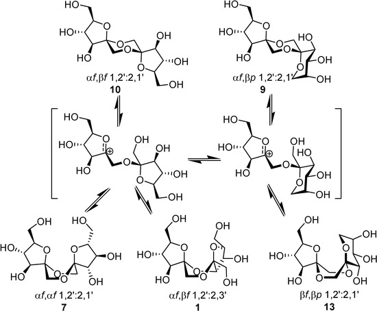 Probable structures of the acyloxonium cations involved in the dimerization reaction of acylated d-fructose precursors.