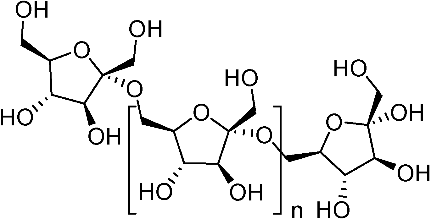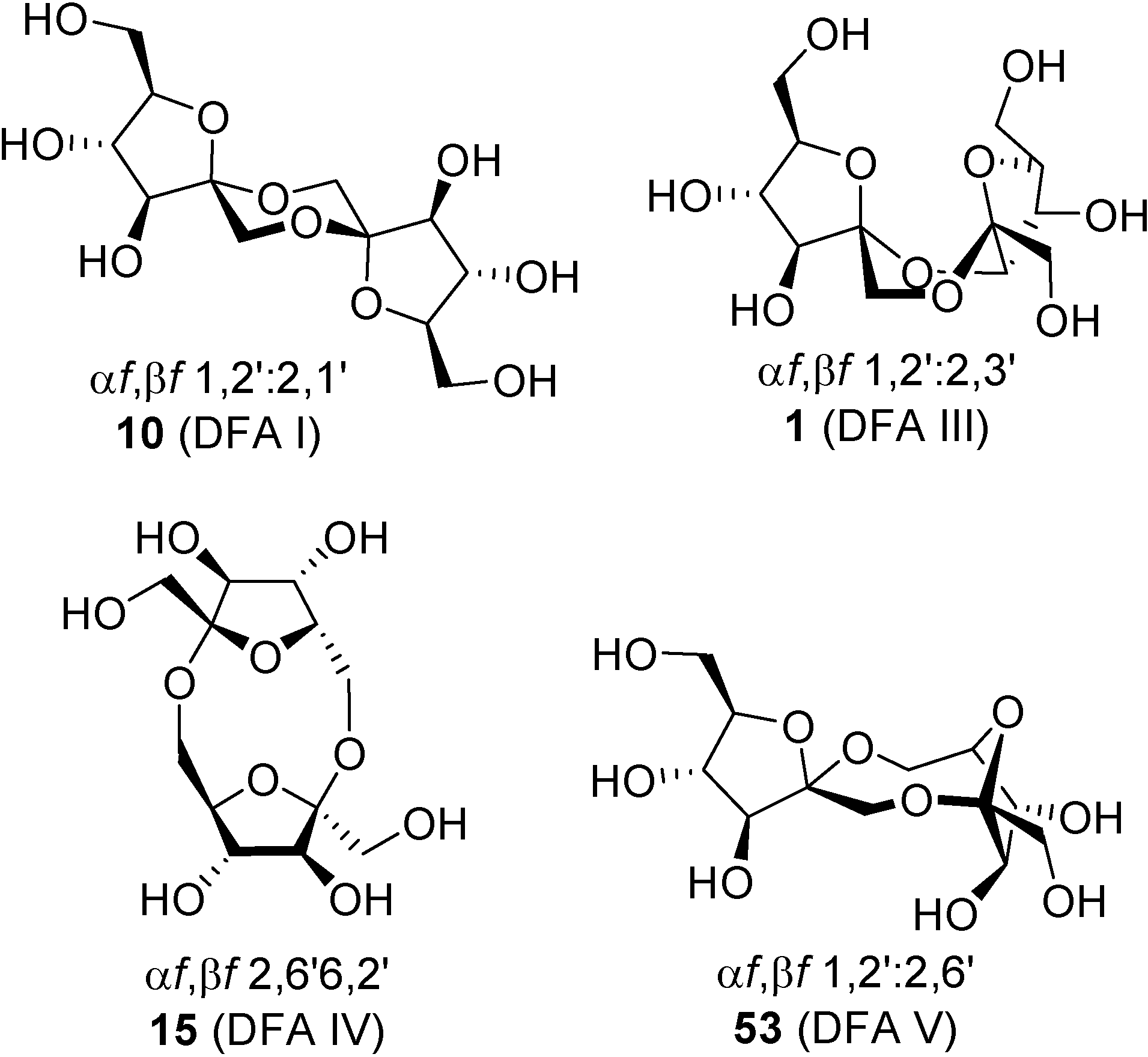 Nutritional studies on DFAs reveal some similarities between this family of cyclic fructodisaccharides and the reducing fructooligosaccharides (FOS) used as prebiotics in the food industry. FOS are mixtures of linear oligosaccharides containing five to ten β-(2→1)-linked fructose units (Figure 3). They are non-digestible substances and behave as soluble alimentary fibers, facilitating intestinal motility. In mammals, including humans, FOS are known to exert a well studied bifidogenic effect in the colon [26,27] and are therefore extensively used as food additives [28,29].