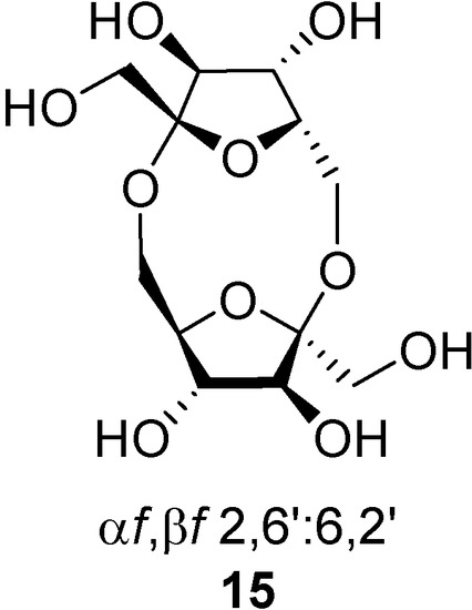 The efficiency of the above transformation deserves a further comment. The presence of the cyclic acetal group at O-4 and O-5 in the starting d-fructose derivative is not only preserving the pyranose cyclic form during spiroketalization, but also stereodirecting the reaction course to the formation of the β-anomeric linkages. The authors state that the effect is probably related to steric hindrance at the α-side in the intermediate oxocarbenium ion, due to the presence of the bulky isopropylidene group, as well as to destabilisation of the known 5C2 conformation of the α-fructopyranose subunit in the isomeric α-d-fructopyranose β-d-fructopyranose 1,2’:2,1’-dianhydride [60,61,62].