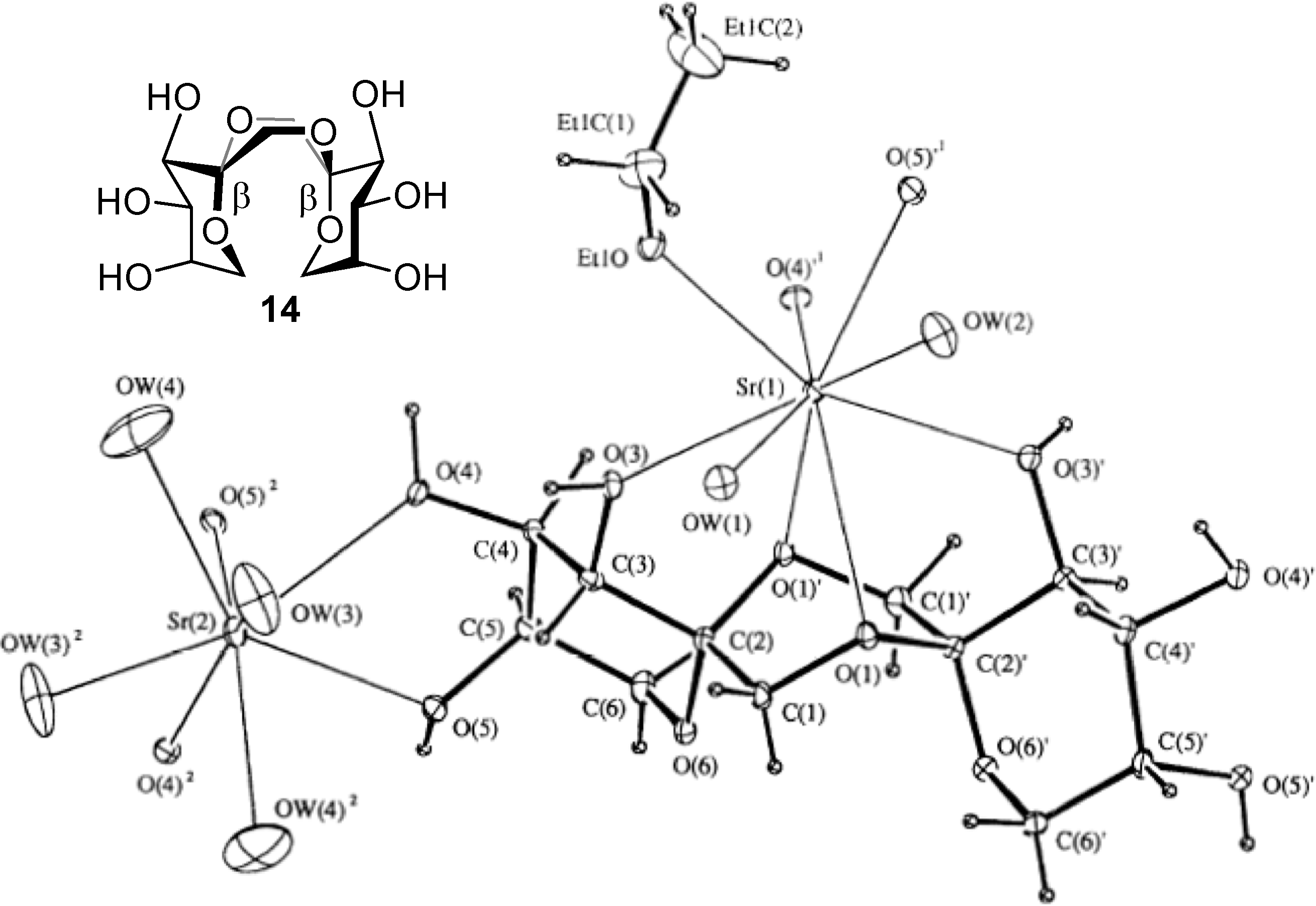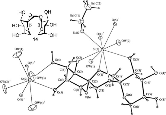 X-Ray structure of the Sr2+−di-β-fructopyranose-1,2’:2,1’-dianhydride (14) complex (reproduced from reference [53], with permission of NRC Research Press).