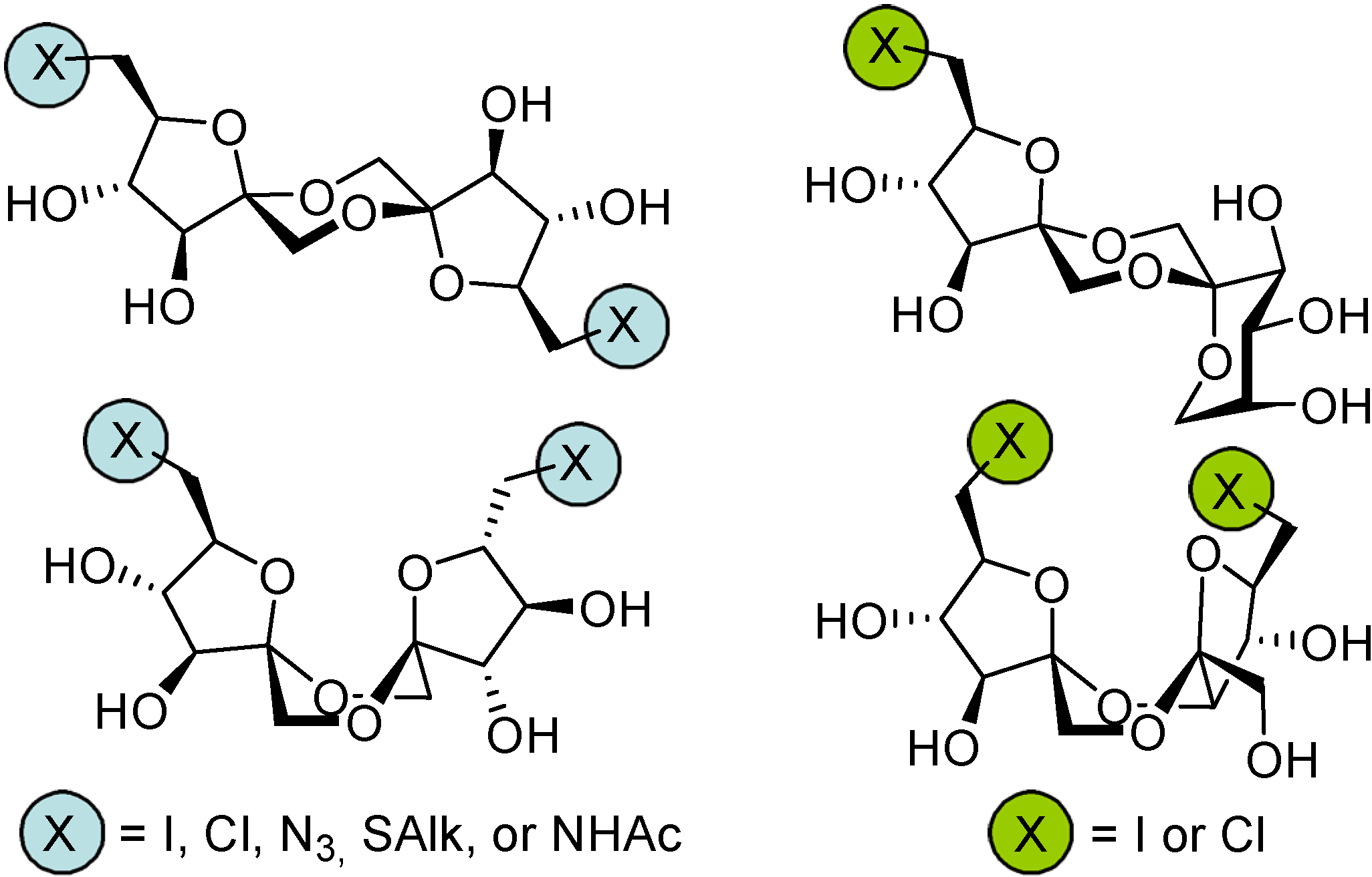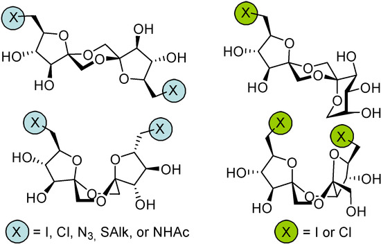 DFAs are also attractive synthetic intermediates. Their stability towards heat and acid hydrolysis makes them compatible with a wide range of reaction conditions. Applications as building blocks or scaffolds for chemical synthesis have been outlined. For instance, taking advantage of reported strategies for the selective functionalization of sucrose and fructooligosaccharides, García Fernández and Defaye have reported the preparation of libraries of DFA derivatives bearing diverse functional groups on their primary positions (i. e. halogens, azide, thioether, amine, or amide) (Figure 6) [56]. Some of the members of these libraries have shown remarkable properties as liquid crystals, while others were excellent precursors of hydrophilic polymers or non-cationic surfactants.