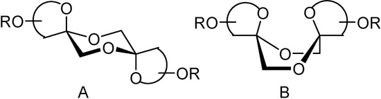 The possibility to control not only the ring size but also the stereochemistry at the spiroketal centers by using participating (ester) or not participating (ether) protecting groups is noteworthy (Table 1). The preference for dissymmetric dispiroketal structures in the case of nonparticipating benzyl protecting groups (Scheme 4, α,β isomers) is in agreement with reported observations for other spiro-ketooligosaccharides [70,71]. These diastereomers can accommodate the anomeric effect at both spiroketal centres with the central 1,4-dioxane ring in a chair conformation being thermodynamically favoured. In order to comply with the anomeric effect, DFAs having identical configuration at both spiroketal centres must adopt instead a boat conformation, an unfavourable arrangement (Figure 7).