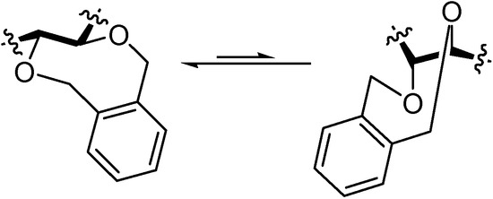 Schematic representation of o-xylylene-protected trans-diequatorial (left) and trans-diaxial (right) 1,2-diol segments.