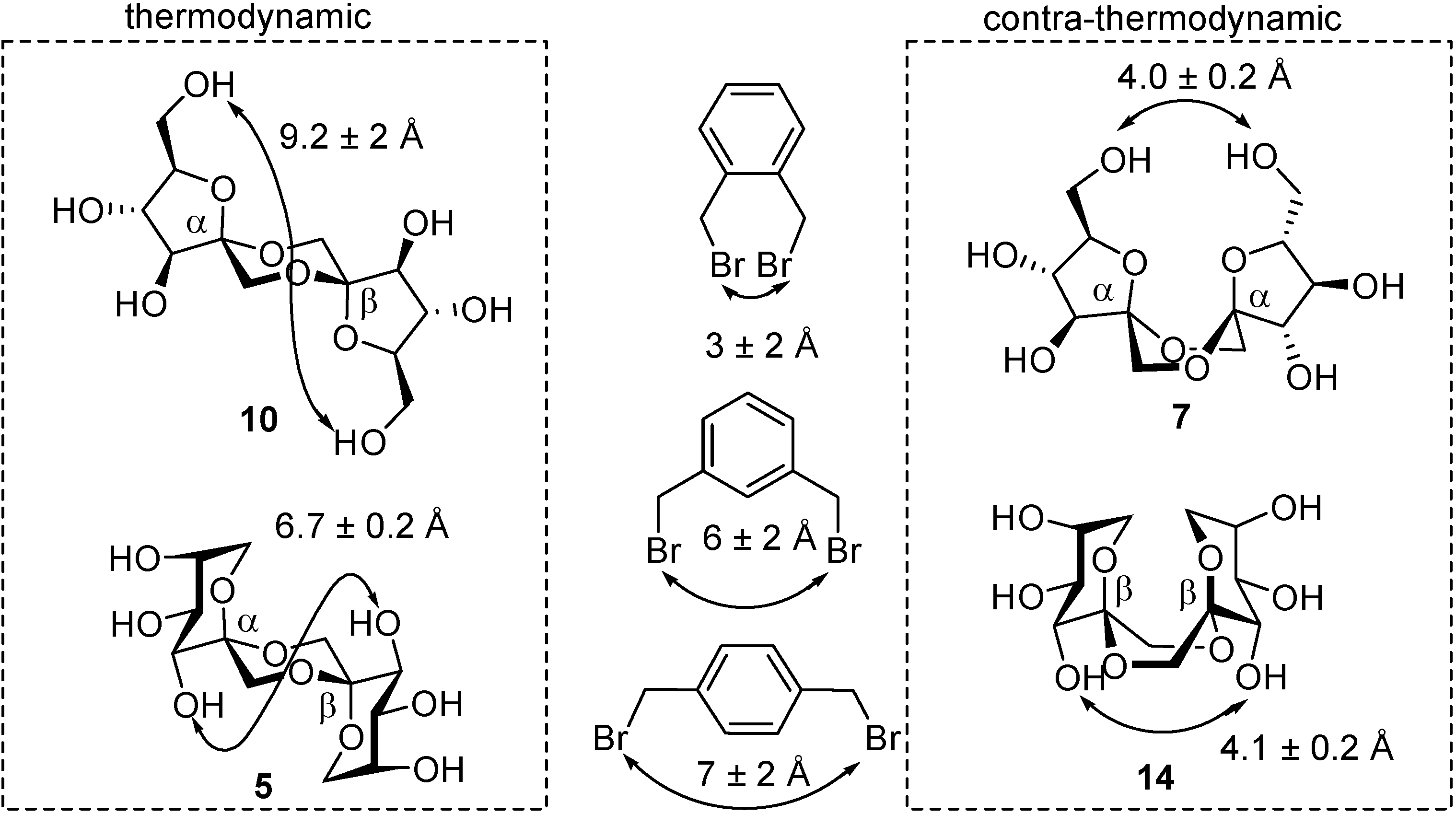 Preferred conformations of type I and type III DFAs positional isomers, with indication of the O-6−O-6', O-3−O-3' interatomic distances, respectively. The distances between the benzylic methylene carbon atoms in α,α'-dibromoxylene positional isomers are also shown.