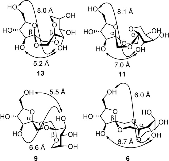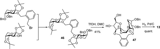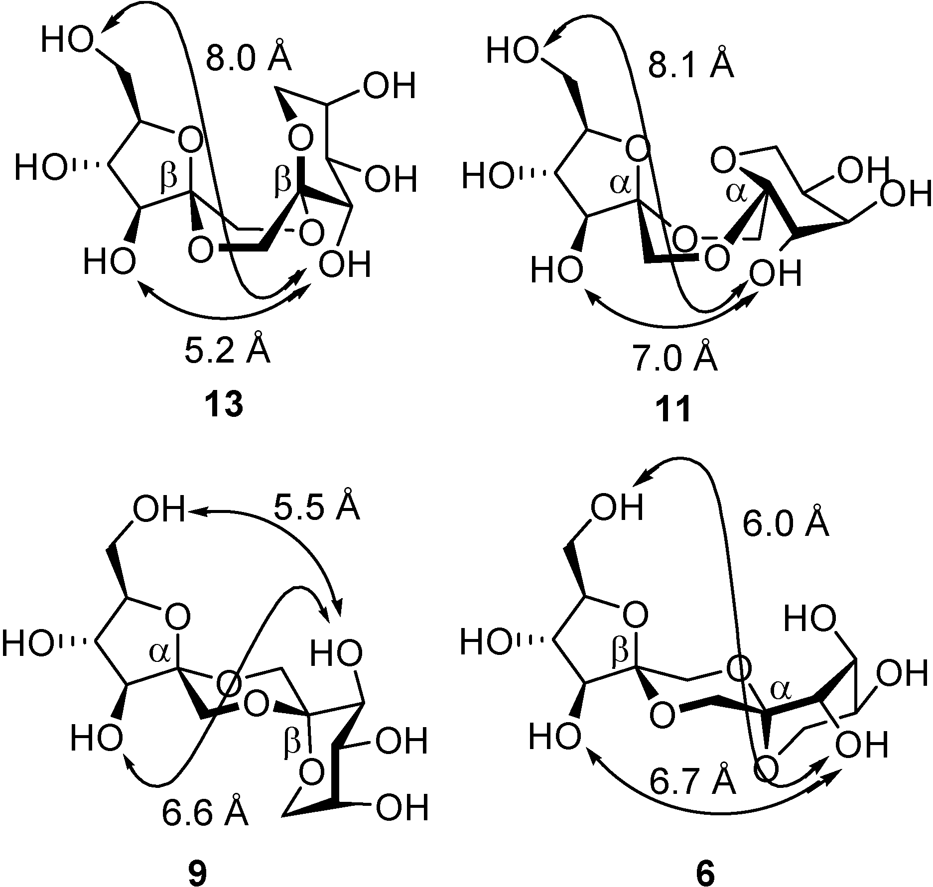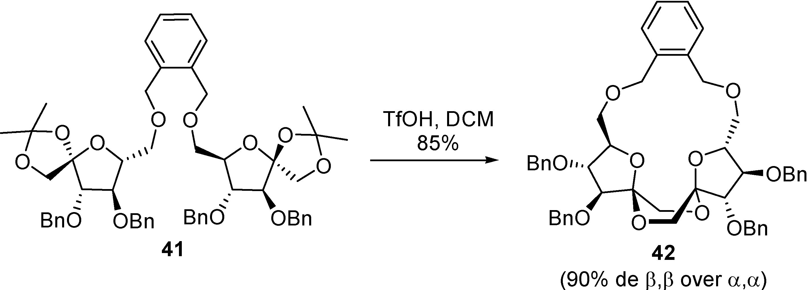 The concept of intramolecular aglycon delivery (IAD) [77], introduced by Hindsgaul [78,79,80] and Stork [81,82] in oligosaccharide synthesis, has been extended to the stereoselective preparation of DFA isomers that are neither thermodynamically nor kinetically favoured (contra-thermodynamic [83,84,85] DFAs). The approach takes advantage of the rigidity of the tricyclic bis(spiroketal) structure and the dependence of the conformational properties on the relative configuration at the spiroketal centres. This is translated into significant differences in the inter-space distance between homologous hydroxyl groups located at the two d-fructose moieties in the DFA molecule within an isomeric series. Inserting a distance restriction element between appropriate positions can then be used to introduce a geometrical constraint during spirocyclization.