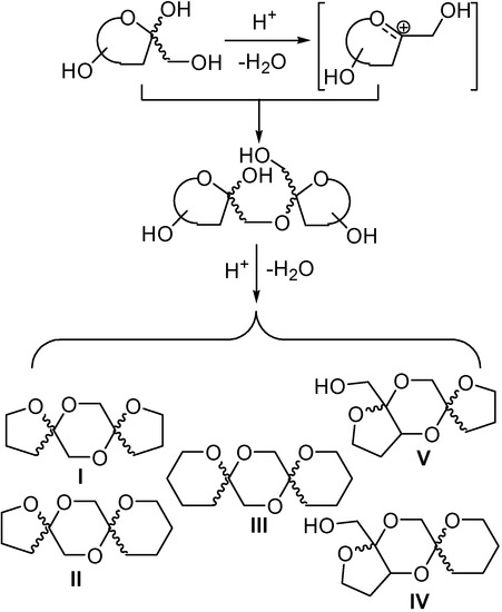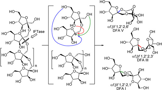 The accepted mechanism for DFA formation involves a fructosyl oxacarbenium cation that undergoes in situ glycosylation to the corresponding keto-disaccharide by reacting with a second fructose molecule. Further intramolecular spiroketalization to close the central 1,4-dioxane ring is a reversible process, the ratio of the different isomeric products varying with time, temperature, and initial concentration. In some favourable cases, the reaction can be driven to the preferential formation of a particular DFA isomer [56].